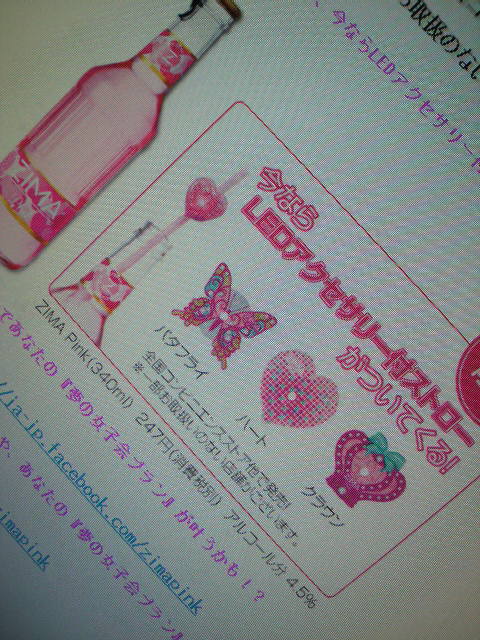 かわい 女子向けピンクのZIMA新発売だって。しかし「女子がかわいらしく ストローで楽しめる、ジーマ ピンクが新発売となります!」ってZIMAをストローなんかで飲んだらイッキに酔いが回っちゃいそーだけど(≧∇≦)でもLED付きストローはちょっと欲しい。ライムを付けてくれるお店が好きデス。もち、ラッパ飲みスタイルで!