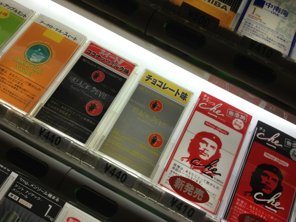 たばこ屋さん 世界の珍しいタバコや葉巻などを取り揃えてる路面店のタバコ屋さんの品揃えがスゴかった。店先の自販機にも、ほら。気になるライナップ。チョコレート味に、ココナッツミルク味。ココナッツ大好きだから、これ買ってみればよかったな〜