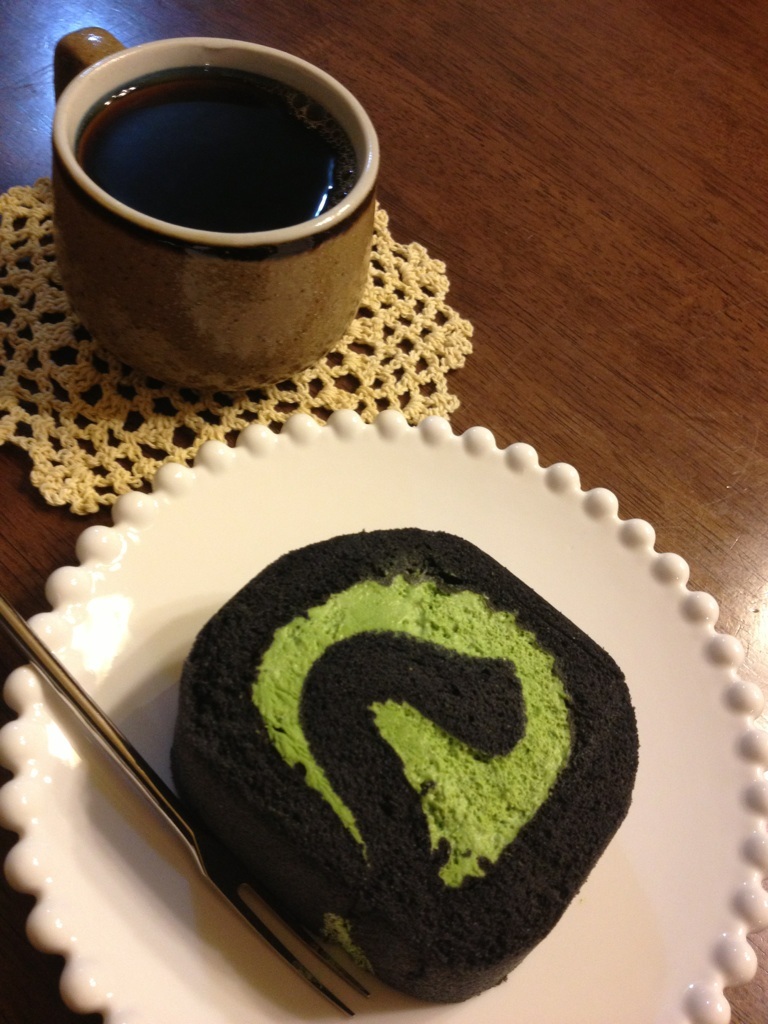 黒ロール Dちゃんがオミヤだよ〜♪って買ってきた黒い箱に入ってた真っ黒なロールケーキ・・・イカスミロールかと思ったよwww京都のお店の、炭×抹茶ロール。炭って食べていいんだね?これ、いまだに納得いかないw