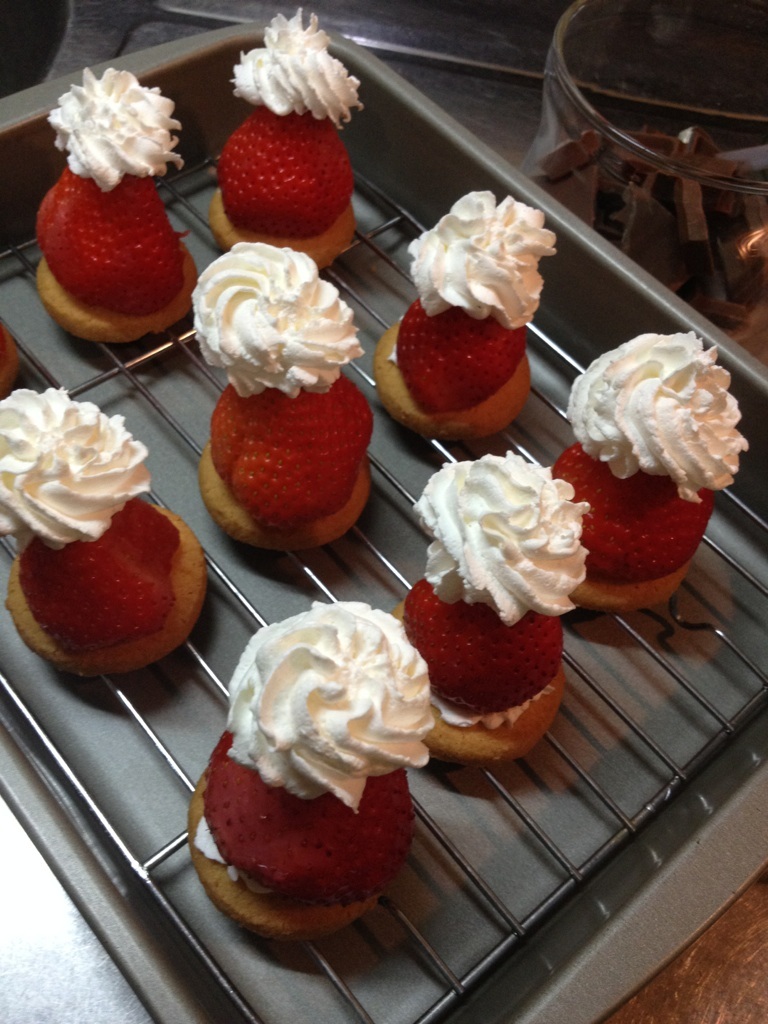 クリームの帽子乗っけて と、ここまでは順調。ここからが、家ではなかなか難しい…当時、ルームメイトで同期の女の子と、これを家で作った事があるの。ブ格好だったけど、味は美味しかった!温かいチョコをかけると、たちまちクリームが溶けちゃうので、しばし、冷凍庫で冷やして〜…