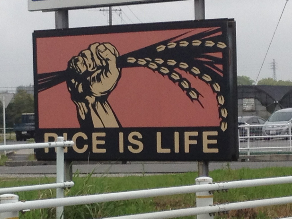田んぼの中に立ってるお米の看板が、