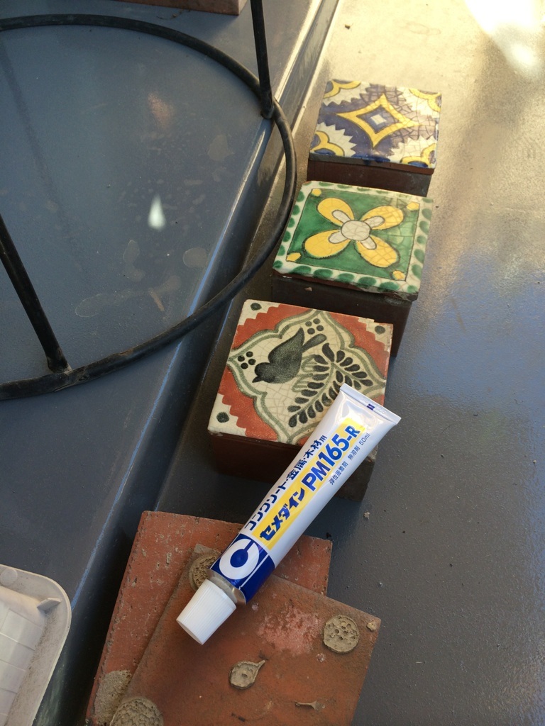 レンガ 私はなぜか とにかくレンガが好きなんだけど、昔、ホームセンターで見つけた可愛いタイルを、四角いレンガに、貼りつけて飾ってたのが、ベランダの工事でほとんど剥がれてしまったので、コンクリート用のボンドで付けなおしたよ。このタイルも、劣化してきて ひび割れてきたりしてて、それがまた イイ感じ。