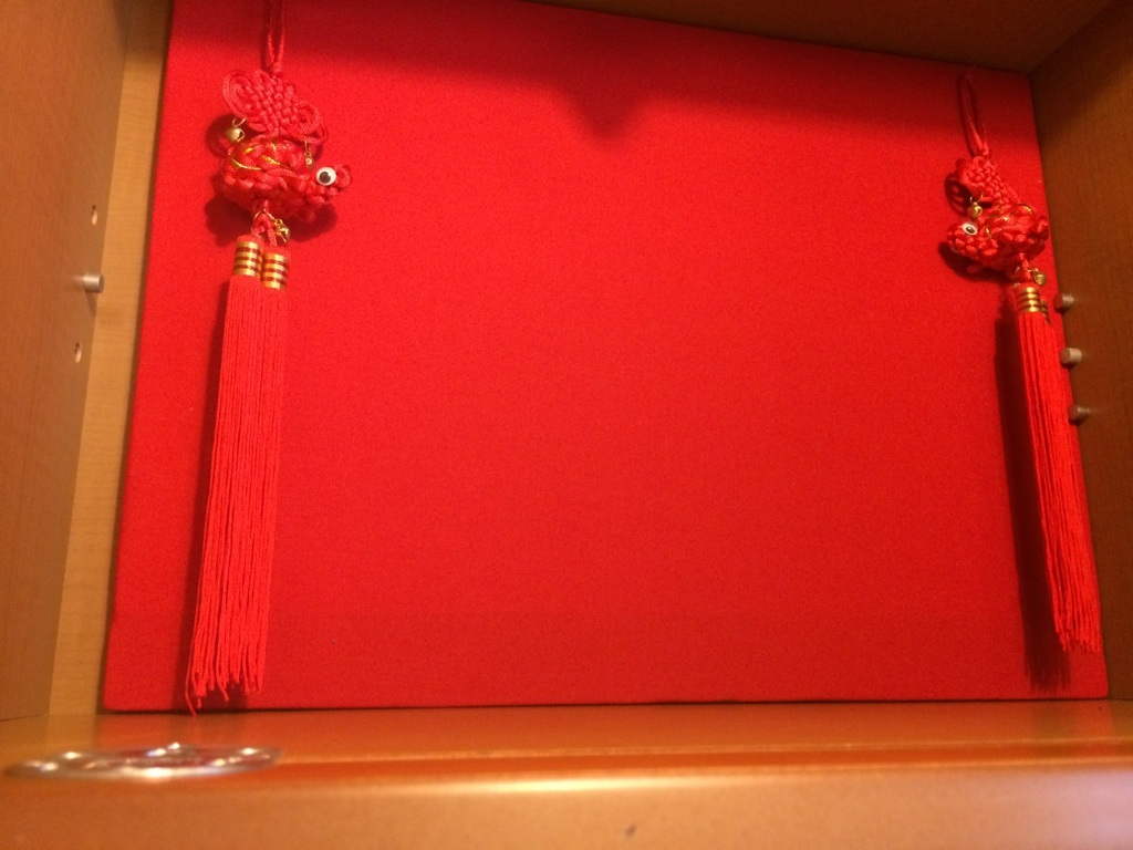 亀の吊り飾り 中国で買ってきたこの飾りをぶら下げて〜これ、魔よけになるんだって。京劇を見に行った時、劇場で買ったモノ。だけど、カラーボードの横幅、足りてない(;∀;)ほんとは縦も足りてなくて、他のカラーボードをくっつけたんだけどやっぱり横もちゃんと付け足して作ればよかったな