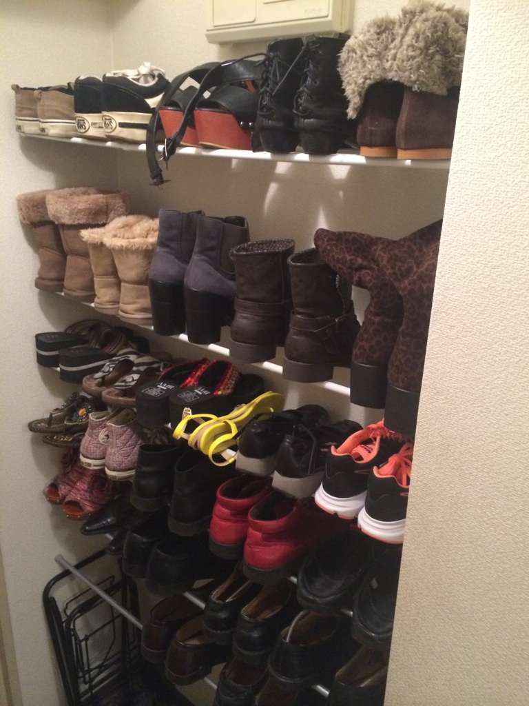 靴収納 転勤族の強い味方!100均の突っ張り棒。今度の家、玄関狭いから、もう下駄箱捨てる事にして、突っ張り棒で靴収納することに。これなら、どんな家に引っ越しても、大丈夫〜昨日、店頭にあったこのサイズの突っ張り棒は全部買い占めたぜ!w それでも足りずに、他の店にはしご。それでも全部は収納できない。くそぉーブレーカーが邪魔!